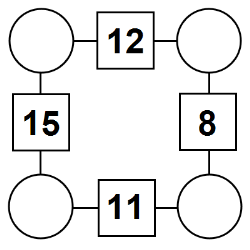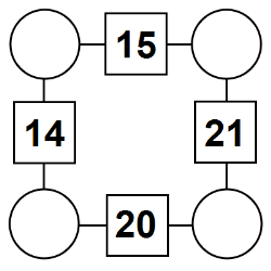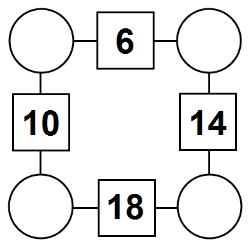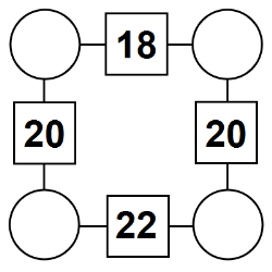 The aim of an arithmagon is to work out which numbers go in the empty circles. The numbers in the square boxes are made by adding together the numbers in the circles either side.