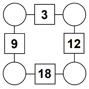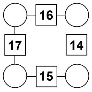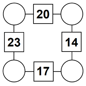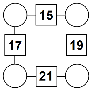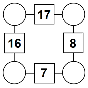 Here are four new Square arithmagons for you to print on a worksheet. Use the buttons below the puzzles the shuffle the arithmagons to create four new puzzles, to view the solution, or to print as a worksheet.