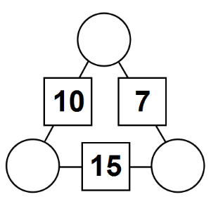 The aim of an arithmagon is to work out which numbers go in the empty circles. The numbers in the square boxes are made by adding together the numbers in the circles either side. For example, if the number in the square box was 10 you could try 6 and 4, but the numbers must also add up on the other edges, making this more difficult than it first appears.