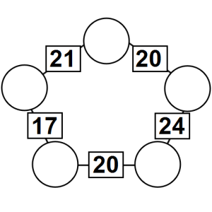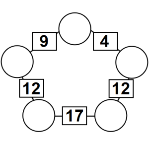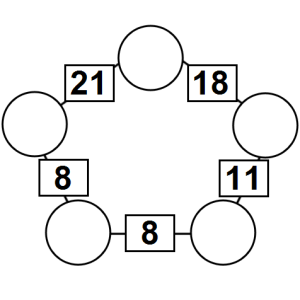 The aim of an arithmagon is to work out which numbers go in the empty circles. The numbers in the square boxes are made by adding together the numbers in the circles either side. For example, if the number in the square box was 10 you could try 6 and 4, but the numbers must also add up on the other edges, making this more difficult than it first appears.