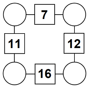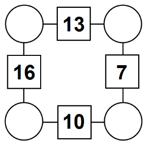 The aim of an arithmagon is to work out which numbers go in the empty circles. The numbers in the square boxes are made by adding together the numbers in the circles either side. For example, if the number in the square box was 10 you could try 6 and 4, but the numbers must also add up on the other edges, making this more difficult than it first appears.