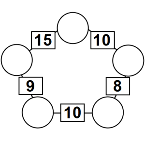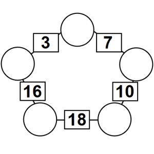 The aim of an arithmagon is to work out which numbers go in the empty circles. The numbers in the square boxes are made by adding together the numbers in the circles either side. For example, if the number in the square box was 10 you could try 6 and 4, but the numbers must also add up on the other edges, making this more difficult than it first appears.