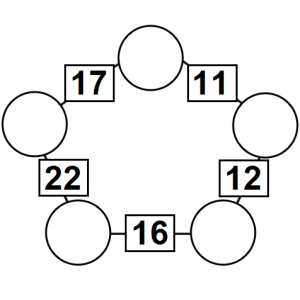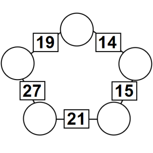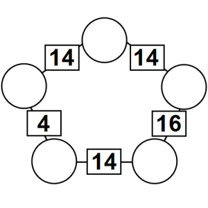 The aim of an arithmagon is to work out which numbers go in the empty circles. The numbers in the square boxes are made by adding together the numbers in the circles either side. For example, if the number in the square box was 10 you could try 6 and 4, but the numbers must also add up on the other edges, making this more difficult than it first appears.